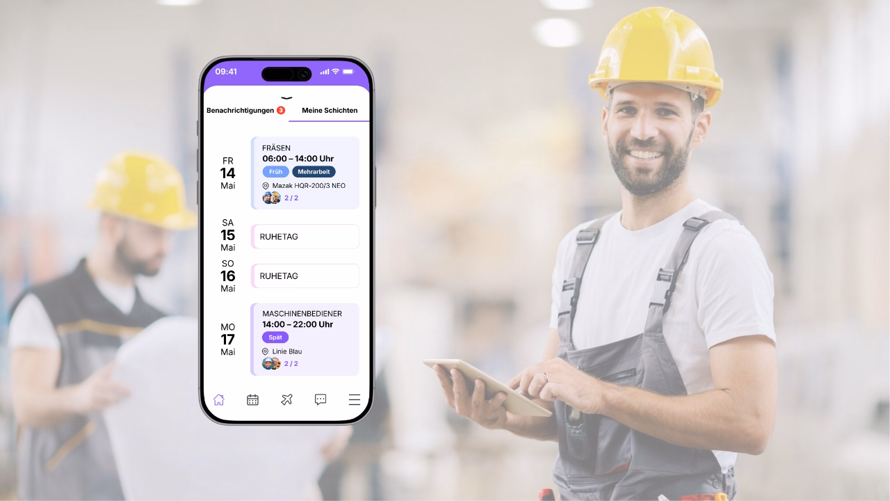 In addition to recording daily working hours via a terminal, you can also easily record staff working hours on the move with shyftplan's digital time clock. You don't need expensive devices or a separate computer for this. For example, simply have your staff clock in and out on a tablet in the entrance area, on their own smartphone or on the computer at their workplace.